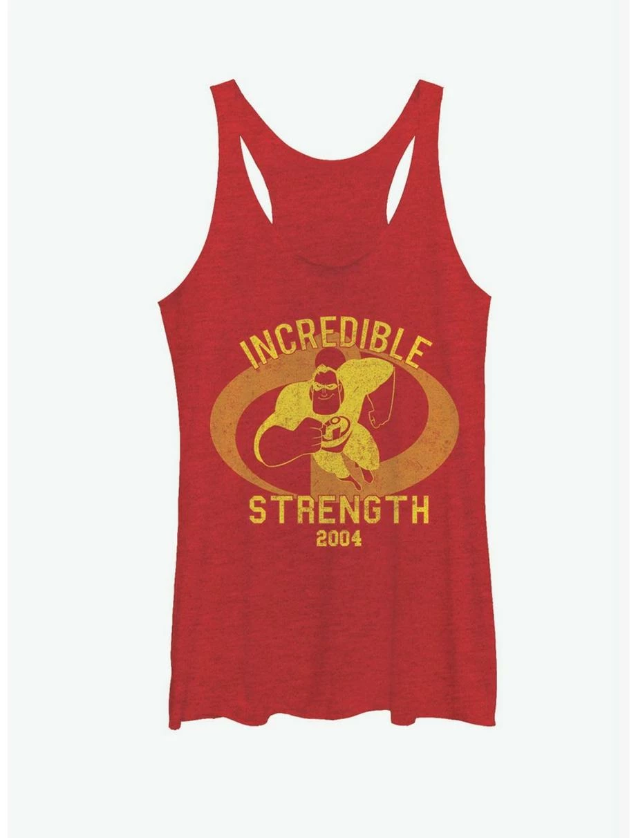 Head to the gym and become your own superhero with the Incredibles Strength 2004 Heather Red Racerback Tank Top! Mr. Incredible makes an appearance in a distressed yellow print that reads “Incredible Strength 2004” on this fun red Incredibles tank top that is perfect for your incredible workouts! 50% Polyester, 25% Cotton, 25% Rayon.