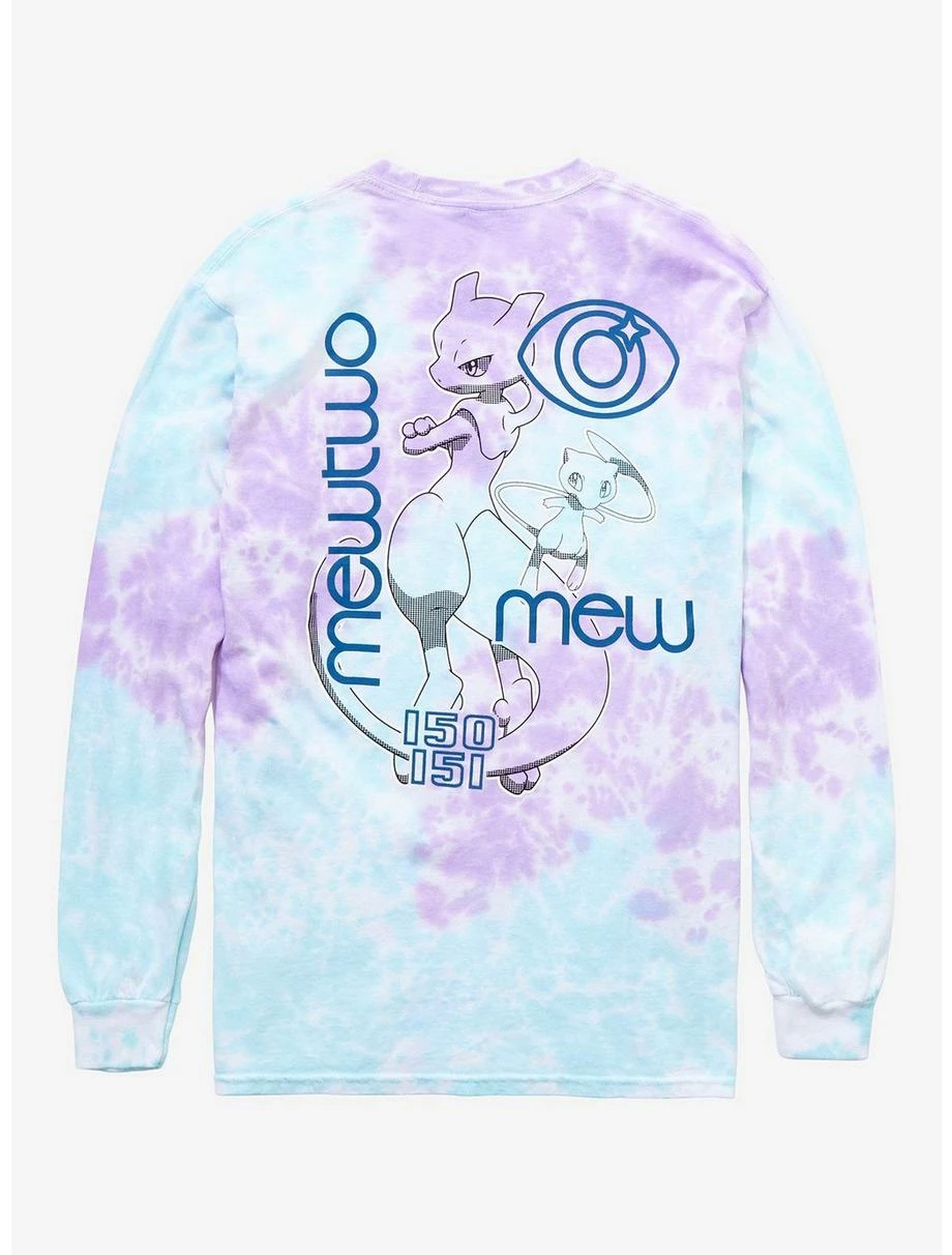 Perfect for a day (or night) of catching more psychic Pokémon to fill your Pokédex, the legendary Pokémon, Mew, floats front and center on the chest of this cozy long sleeve tee. With a pastel tie-dye wash, the back features Mew’s fabled augmented clone, Mewtwo, in a ready-for-battle stance.