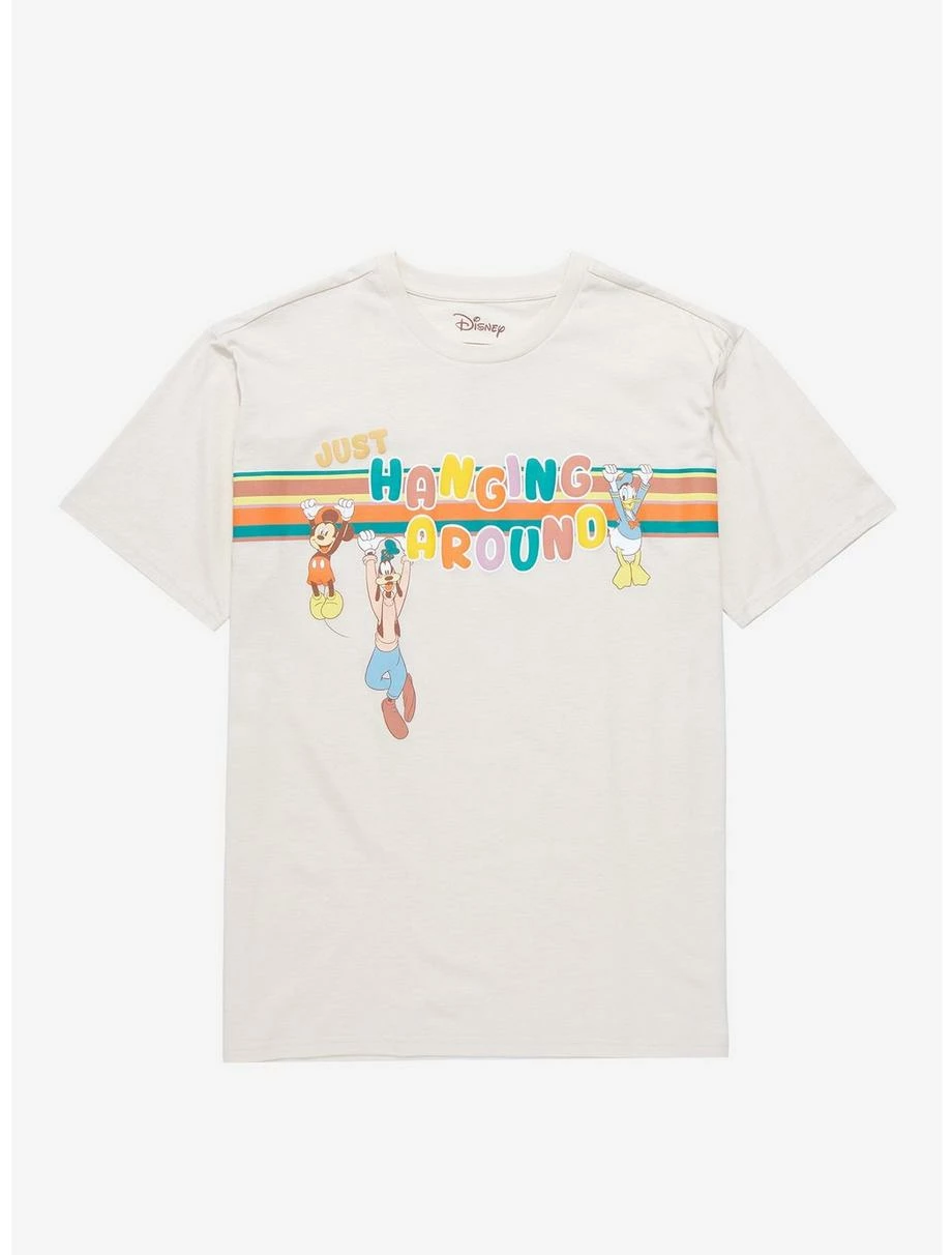 Hang around in Disney style! Your favorite friends, Mickey Mouse, Goofy, and Donald are seen as pastel portraits as they hang from the striped accent on the chest. With “Just Hanging Around” bubble lettering, this tee is perfect for bringing your favorite pastime to your next outfit.