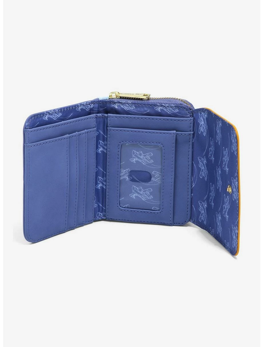 The Talespin crew are flying the Sea Duck right into your wardrobe as this small zip wallet from Loungefly! Featured as adorable watercolor-style graphics on this style, Baloo, Rebecca, and Molly are seen on the front flap, while Kit’s trailing behind the Sea Duck on the back! With multiple card slots, a bills compartment, clear ID sleeve, and accordion-style zippered pocket, you’ll be able to carry everything you need for your daily adventures.