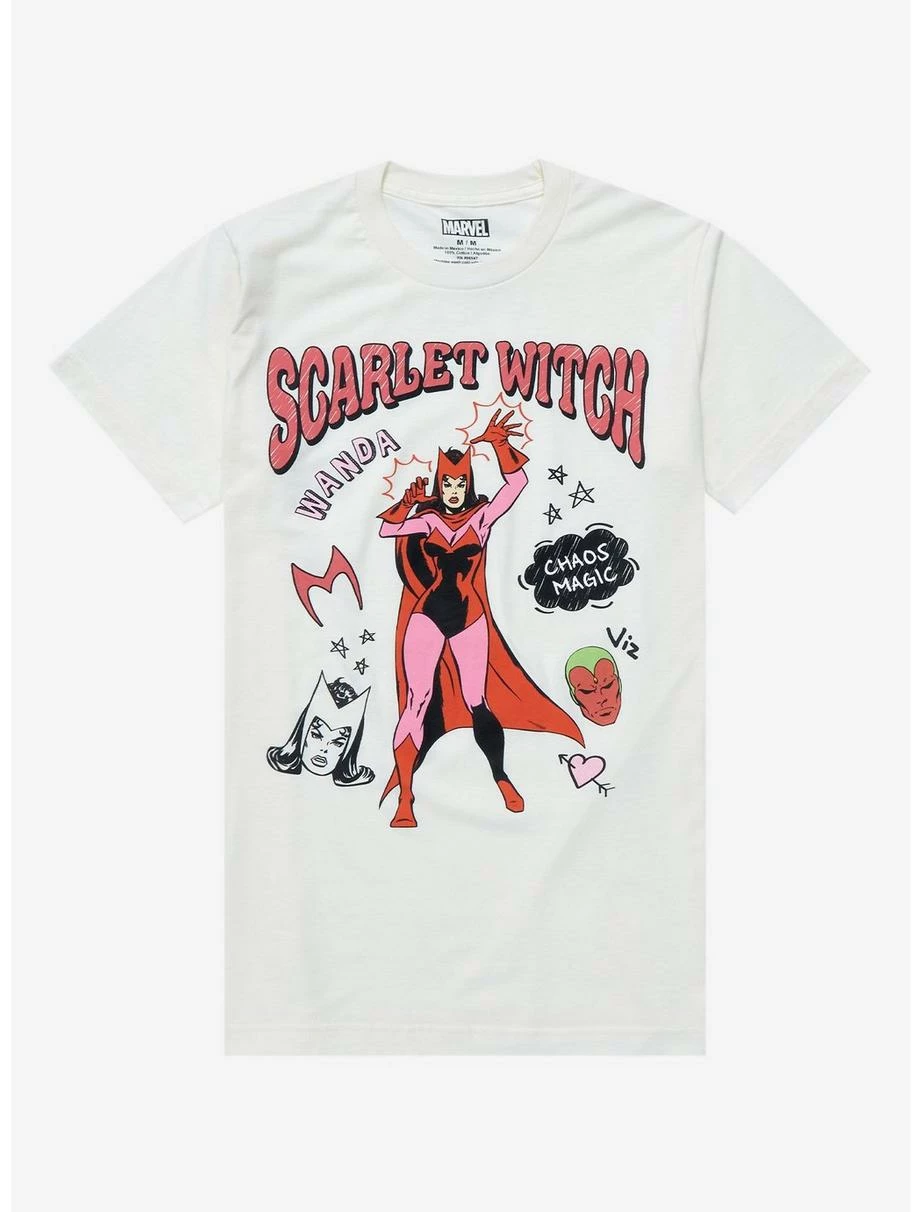 Harness the chaos magic within with this Scarlet Witch tee! The Marvel magic user appears in a retro-style graphic surrounded by doodle details like her crown, Vision, and stars.